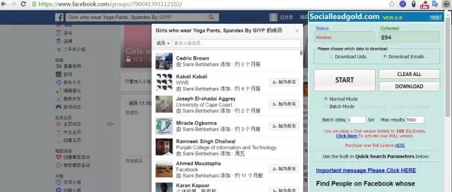 另外也要注意,在这个Facebook的群组中,并不是全部的人都是你的潜在客户,原因很简单,比方一个老外是做服装的,他也可能加入一些电子产品的Facebook推广群组,甚至他根本没有做任何生意,加入电子产品的群组只是为了娱乐而已。根据我的经验,如果一个邮箱中含有你们产品的关键词,这个用户一般是做这类产品的生意的。所以你可以全选邮箱,然后按一下clrl+F,输入你们的关键词,从而快速锁定最精准的客户。希望大家好好利用这两个工具,开发更多的客户。